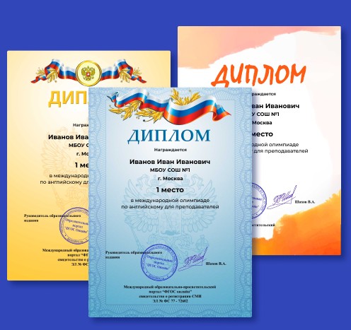 Мы собрали десятки олимпиад, конкурсов и тестов как по русскому языку так и по всем предметам. На сайте ФГОС Онлайн вы найдете - Олимпиады по русскому языку для 1 класса- Олимпиады по русскому языку для 2 класса- Олимпиады по русскому языку для 3 класса- Олимпиады по русскому языку для 4 класса- Олимпиады по русскому языку для 5 класса- Олимпиады по русскому языку для 6 класса- Олимпиады по русскому языку для 7 класса- Олимпиады по русскому языку для 8 класса- Олимпиады по русскому языку для 9,10,11класса- Олимпиады по русскому языку для студентовПосле прохождения онлайн олимпиады вы сможете заказать именной диплом с оплатой на сайте.